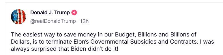 해석: 수십억 달러에 달하는 우리 예산을 절약하는 가장 쉬운 방법은 일론의 정부 보조금과 계약을 해지/종료하는 것입니다. 나는 바이든이 그렇게 하지 않은 것이 항상 놀라워요!